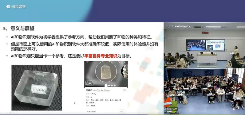 在同步课堂活动中,浙江大学农业资源与环境专业胡文凯同学作为小组代表,进行了“AI助力矿物检索可视化”主题汇报。两校师生从技术原理、应用场景等对“AI技术在矿物信息识别中的应用”展开了深入探讨,并最终形成共识——面对AI技术的革新浪潮,更需要丰富自身专业知识、练就“火眼金睛”,在人机协同的新范式下发挥专业人才的不可替代性价值。