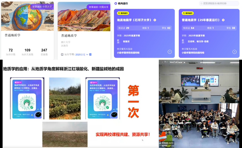 为积极响应教育部“慕课西行”的号召和深入实施高等教育数字化战略,在浙江大学、石河子大学及智慧树平台的指导与支持下,2025年3月14日晚,浙江大学环境与资源学院与石河子大学农学院再次合力开展了“慕课西行 同步课堂”活动,共同探索“智慧教育元年”的《普通地质学》AI赋能教学。