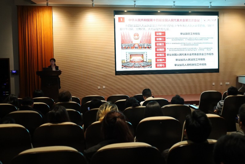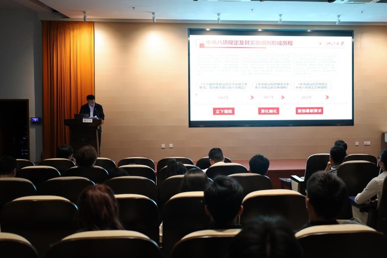 最后,学院党委书记兼副院长陈丁江主讲了中央八项规定精神导读党课。他就中央八项规定及其实施细则的形成历程、中央八项规定的具体内涵,违反中央八项规定精神的具体表现,高等学校深化落实中央八项规定精神的若干规定等内容做了深入阐释和解读。