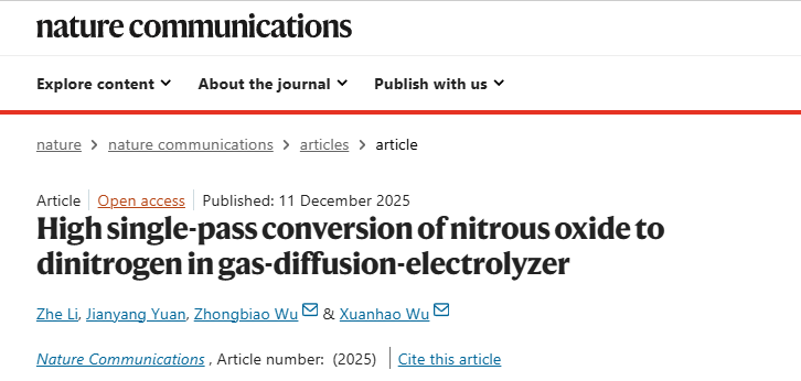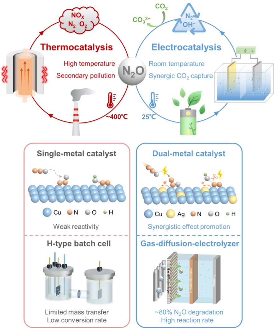 氧化亚氮(N2O)是仅次于二氧化碳和甲烷的第三大温室气体,其全球变暖潜势(GWP)可达CO2的273倍,并能显著破坏臭氧层,已被视为21世纪主要的人为臭氧消耗物质之一。工业排放(如己二酸、硝酸生产尾气)是其重要人为来源,这类废气中N2O浓度较高(0.3~40 vol.%)、排放集中,适宜进行定向治理。目前广泛采用的热催化技术存在能耗高、碳排放量大、催化剂易失活等局限,因此迫切需要发展低温、高效且可持续的新型减排途径。电催化N2O还原反应作为一种环境友好、可在温和条件下进行的替代技术,显示出良好前景,但面临单程转化率低(通常<30%)的瓶颈。该问题主要源于两方面:一是反应器内传质效率低,传统电解池中N2O溶解度有限、扩散路径长;二是催化剂本征活性不足,N2O分子化学惰性强,其在催化剂表面的吸附与活化过程能垒较高,后续N–O键加氢断裂步骤动力学缓慢。这些因素共同制约了该技术的整体转化效率与实际应用可行性。