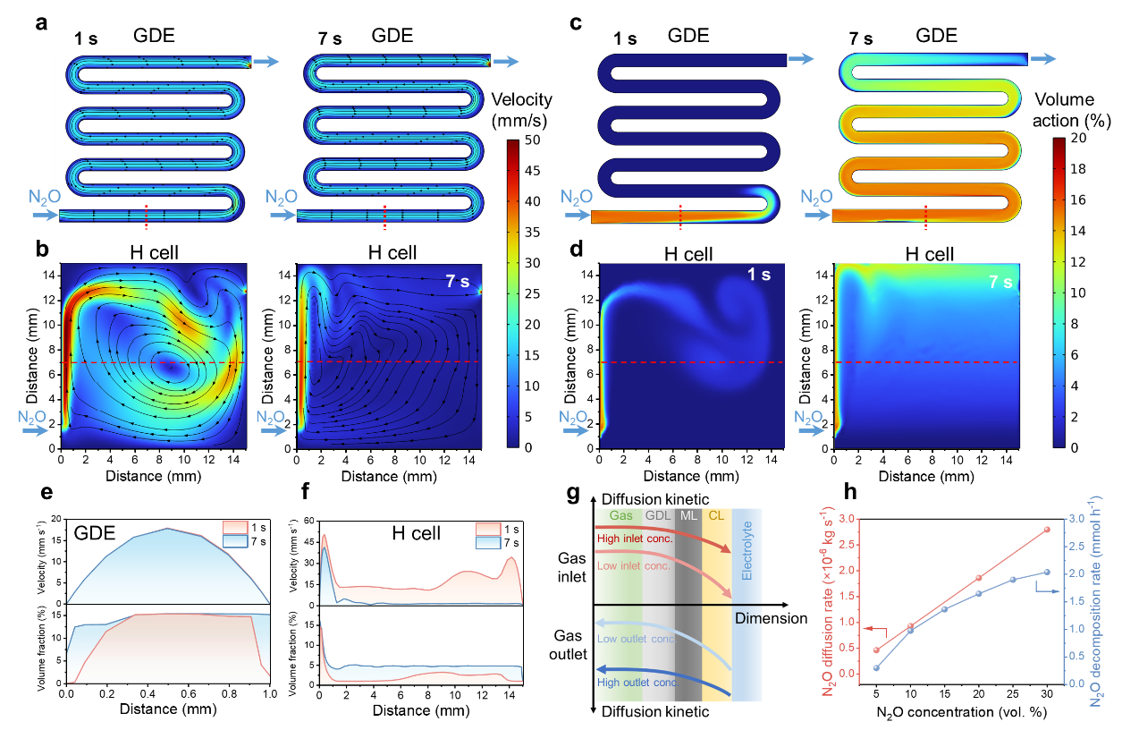 图3 N2O流动状态的CFD模拟。(a)GDE和(b)H型电解池中N2O沿电极表面的流速分布::(c)GDE和(d)H型电解池中N2O沿电极表面的体积分数分布。(e)GDE和(f)H型电解池中N2O流速和体积分数随距离的变化关系。(g)气体从流道到气-液-固三相边界扩散动力的示意图。(h)不同浓度下的N2O理想扩散速率和分解速率。
