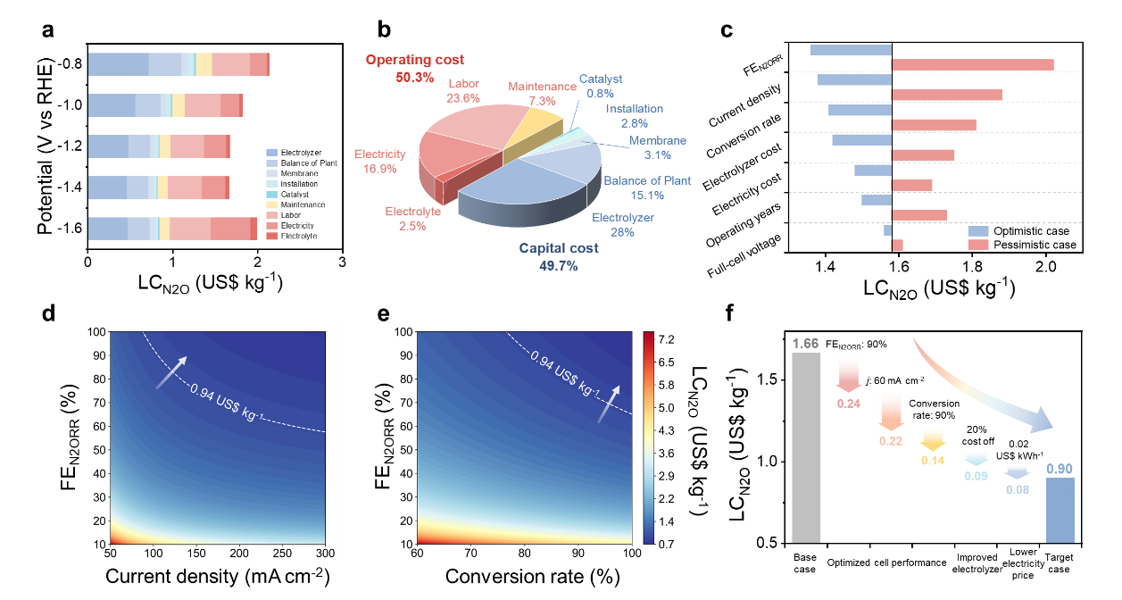 图6 N2O分解技术的技术经济评估。(a)N2ORR在实验电位范围内的N2O降解平准化成本(LCN2O)。(b)LCN2O的成本分布与(c)敏感性分析。LCN2O依赖于(d)FEN2ORR和电流密度(转化率为80%)以及(e)FEN2ORR和转化率(电流密度为100 mA cm⁻²)的等高线图。(f)多参数优化综合降低LCN2O的路线图。
