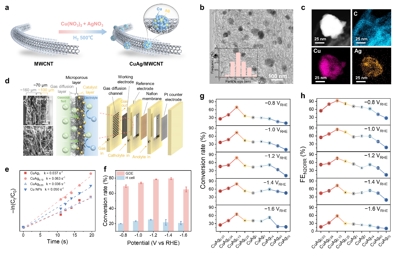 图2 CuAg/MWCNT催化剂理化表征及其N2ORR性能。(a)CuAg催化剂合成示意图。(b)催化剂TEM图像和粒径分布。(c)催化剂EDS元素分布图。(d)GDE的示意图和气体扩散机制,以及工作电极SEM图像。(e)催化剂的反应速率拟合曲线。(f)在GDE和H型电解池中的N2O转化率对比。(g)CuAg催化剂在不同电位下的10 vol.% N2O转化率和(h)法拉第效率(FEN2ORR)。