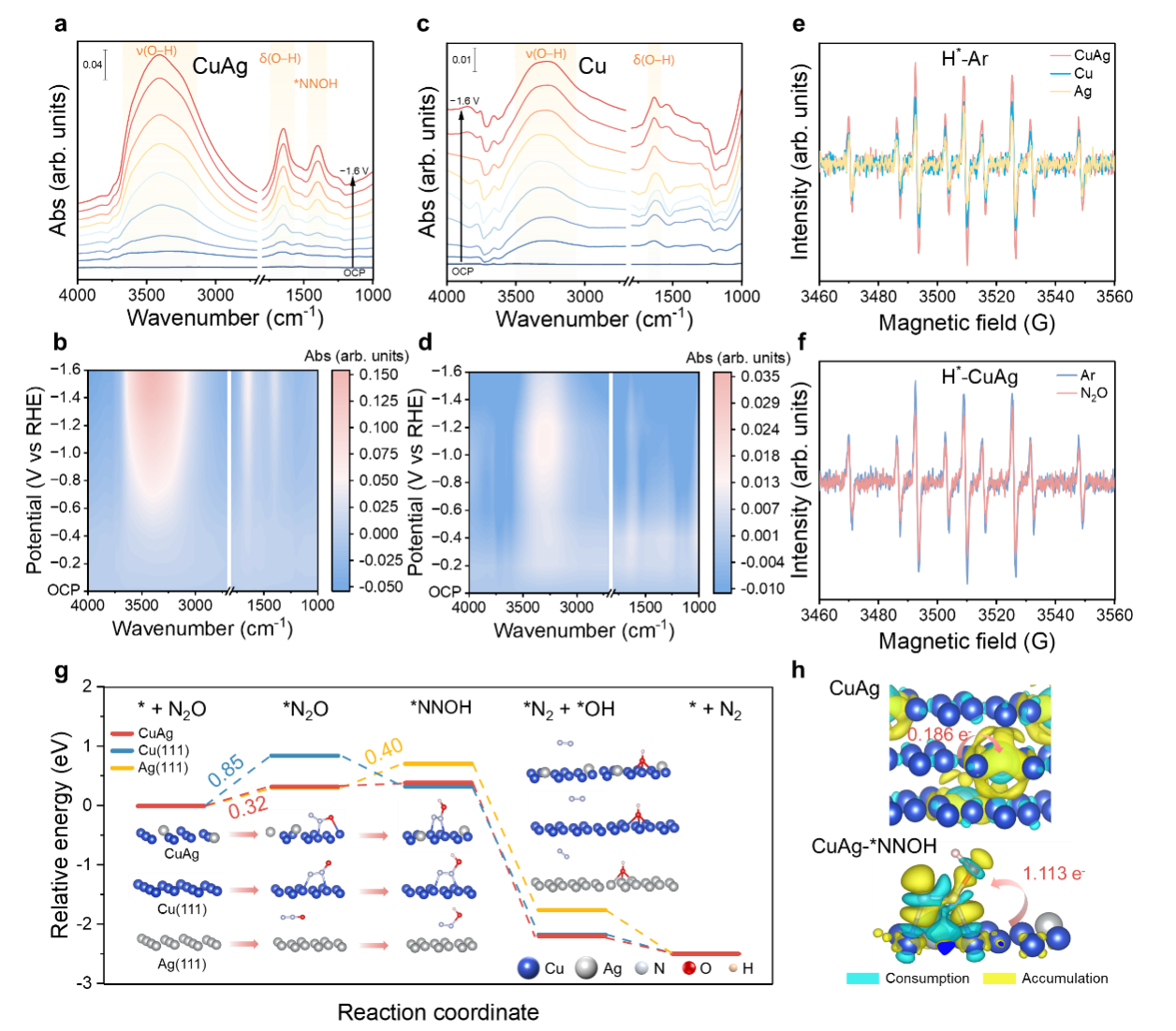 图5 N2ORR的机理分析。(a,b)CuAg和(c,d)Cu上N2ORR的原位DRIFTS光谱。(e)CuAg、Cu和Ag在N2O饱和条件下的活性氢EPR谱。(f)CuAg在Ar和N2O饱和条件下活性氢EPR谱。(g)N2ORR在CuAg、Cu(111)和Ag(111)上的自由能图和中间体构型。(h)CuAg和CuAg-*NNOH的差分电荷密度图。
