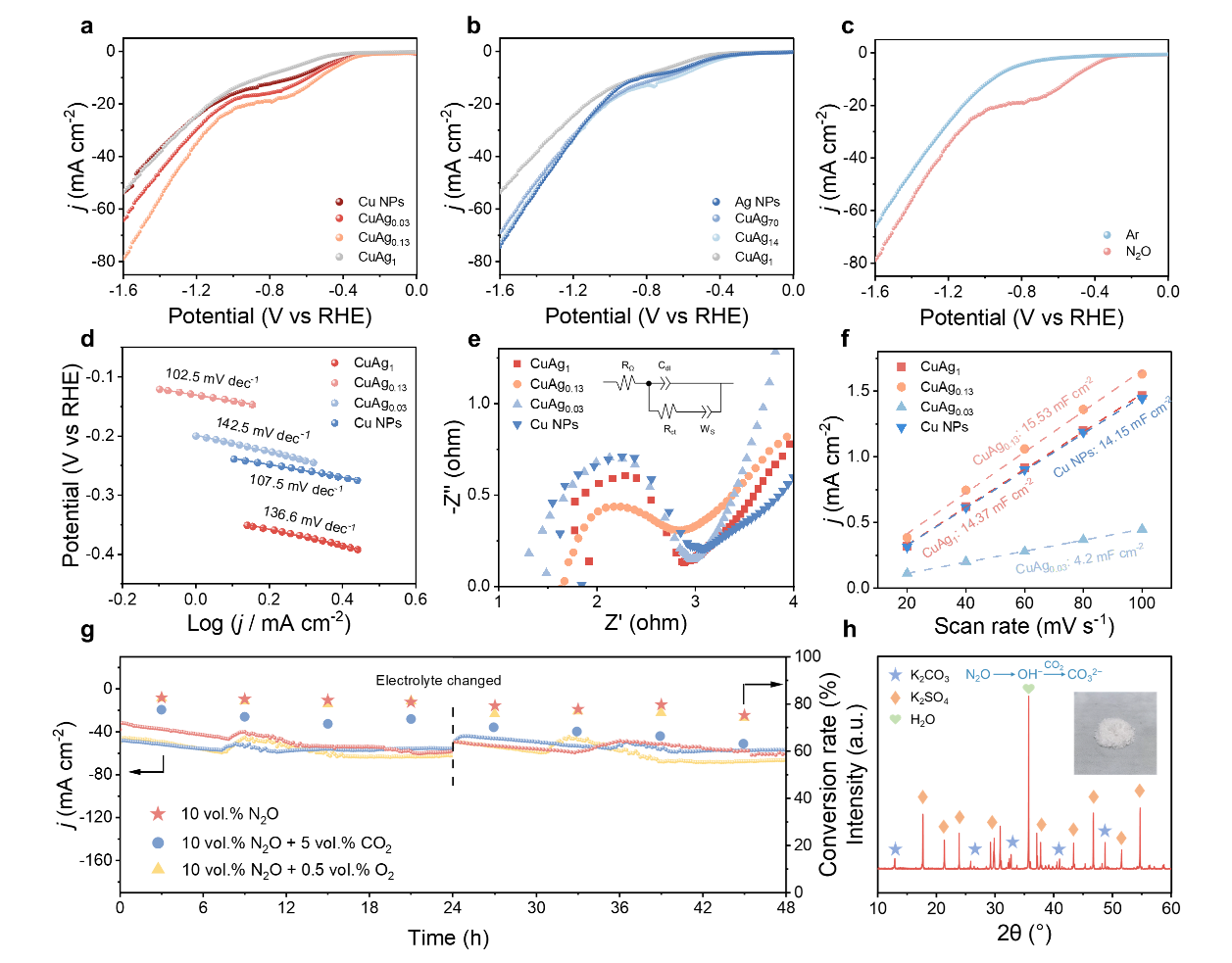 图4 CuAg纳米合金催化剂在N2ORR中的电化学性质。(a-b)不同催化剂在N2O饱和电解质中的LSV曲线。(c)CuAg0.13在Ar和N2O饱和电解质中的LSV曲线。(d)催化剂在N2O饱和条件下的Tafel斜率、(e)Nyquist图和(f)Cdl测量结果。(g)CuAg0.13在不同气体氛围下48小时内的电流密度和N2O转化率。(h)反应后电解质的XRD图谱。